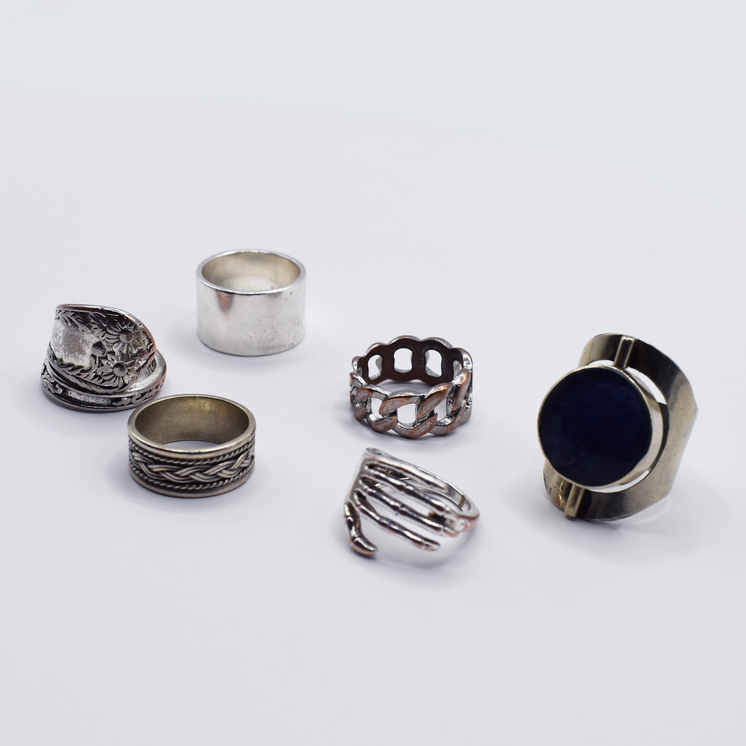 A set of six silver rings, each with a unique design. Over time, the rings have developed a bit of tarnish from regular use, adding character and history to the pieces. They vary in style, making them versatile enough to mix and match.